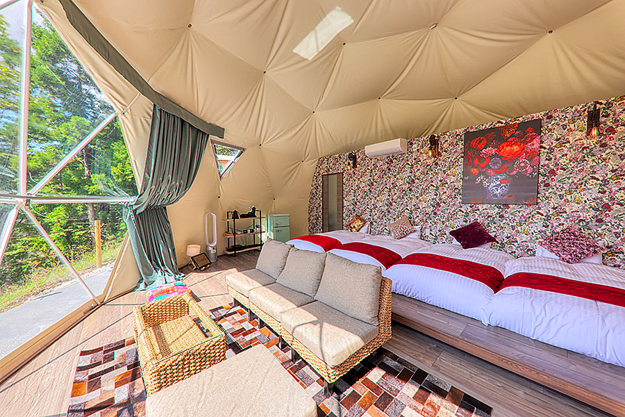 直径8mの大型ドーム型テントに小上がりを設置。大人4名様でもゆったりとお休みいただけます。