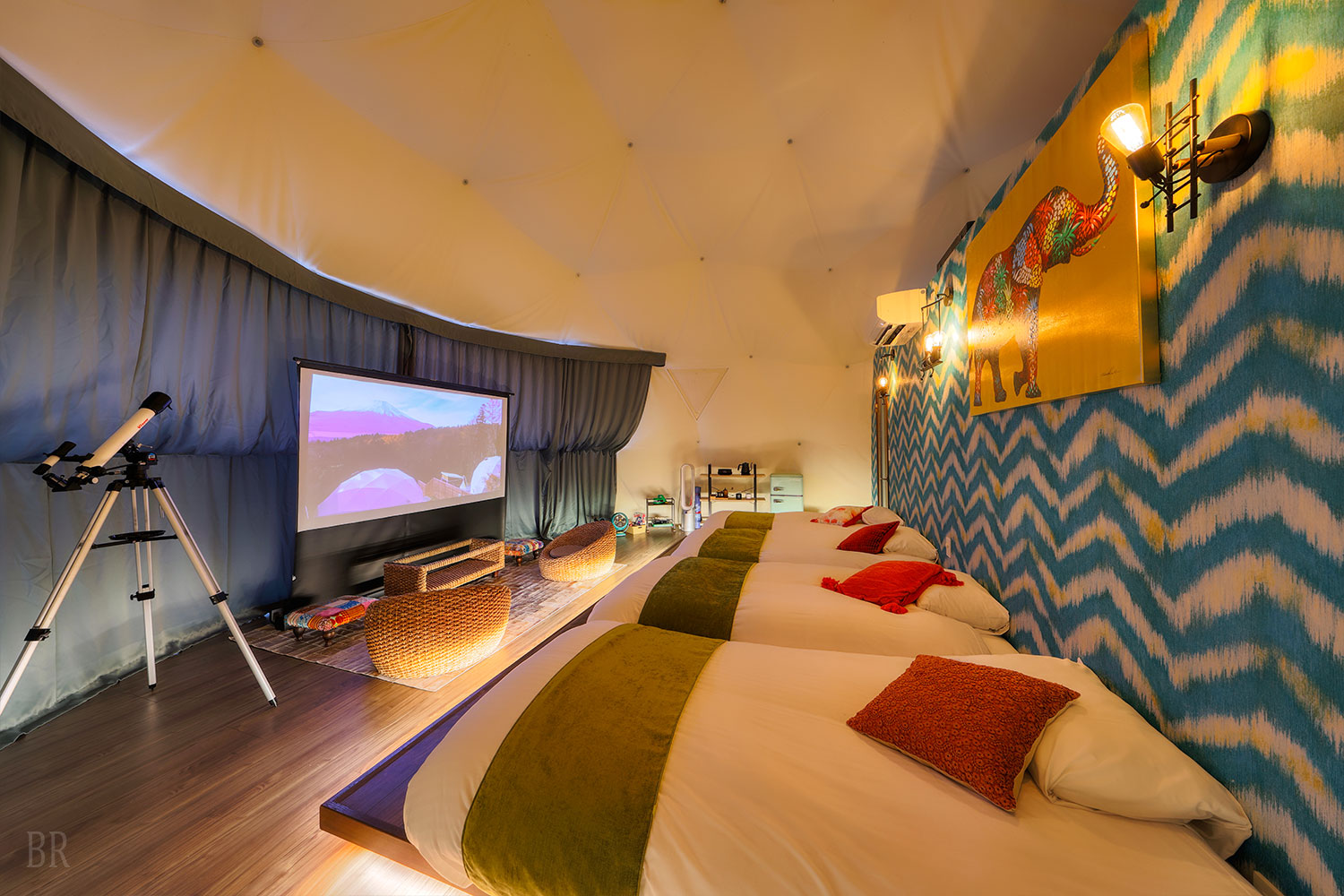 直径8mの大型ドーム型テントに小上がりを設置。大人4名様でもゆったりとお休みいただけます。